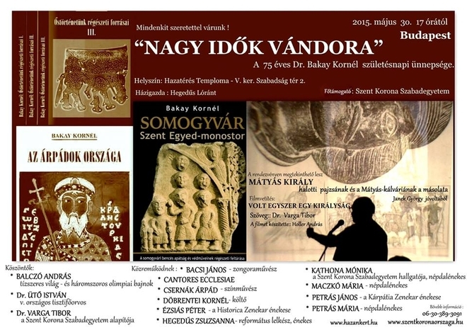 75. születésnapját ünnepli Dr. Bakay Kornél régész, tanár, múzeumigazgató, politikus, ősmagyar-kutató. Nagyszabású ünnepség keretében köszöntik a „nagy idők vándorát”, május 30-án születésnapja alkalmából.