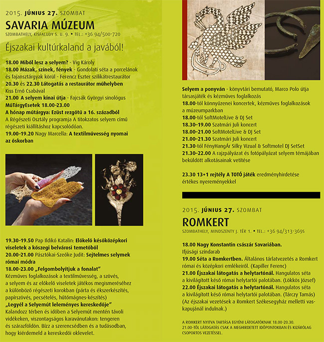 Az eddig tapasztalatok alapján, a nagy sikerre való tekintettel a programokban az idén is részt vesz a levéltár és a törvényszék. A kínálat sokrétű, ám tematikájában direkt vagy indirekt módon igazodik a Savaria Múzeum Selyem-sorozatához. A programok sokszínűsége miatt minden korosztály megtalálja a kedvére valót, ezért szeretettel várnak ifjakat és idősebbeket egyaránt.