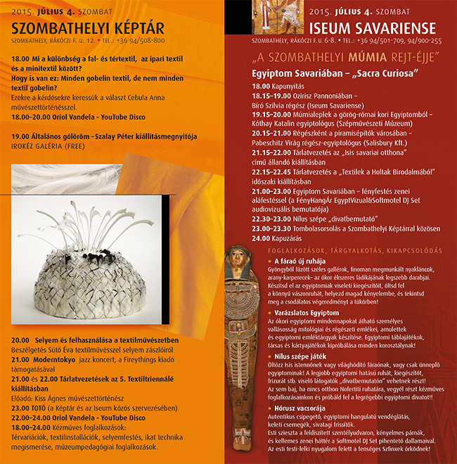 Július 4-én a képtár és az Iseum ad otthont a múzeumok nyári éjszakáinak. Cebula Anna, a Képtár igazgatója elmondta, programjaik a textilhez igazodnak, mivel június 26-án rendezik az 5. Textilművészeti Triennálét. A nyári éjszaka Cebula Anna előadásával kezdődik, aki bemutatja, mi a különbség a fal- és a tértextil, az ipari és a minitextil között. Arra a kérdésre is választ keres, hogy miért minden gobelin textil, de nem minden textil gobelin. 19.00 órakor Szalay Péter kiállításmegnyitója lesz Általános gólöröm címmel, az Irokéz Galériával közösen. Sütő Éva textilművész a selyem és felhasználása a textilművészetben rejtelmeibe vezet, de lesznek tárlatvezetések (köztük zseblámpás), kézműves foglalkozások és YouTube disco is.