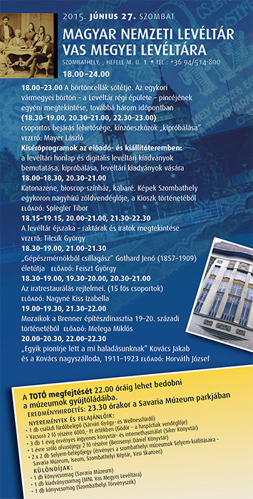 Dr. Tilcsik György, a levéltár igazgatója a levéltári programokat mutatta be. A levéltár 2009 óta vesz részt a múzeumok éjszakájában. A legnagyobb érdeklődés a börtöncella sötétje iránt mutatkozik, ezért tovább fejlesztették a kínálatot, már deres és akasztócellák is megtalálhatók, sőt a kínzóeszközök ki is próbálhatók. Megtekinthetők lesznek a levéltári kiadványok, illetve az iratretusálás rejtelmeibe is bepillantást nyerhetnek az érdeklődők. Előadások is lesznek, Gothard Jenőről Feiszt György beszél, a Berrener építészdinasztiáról Melega Miklós, Horváth József pedig a nagyszálló történetét mutatja be.