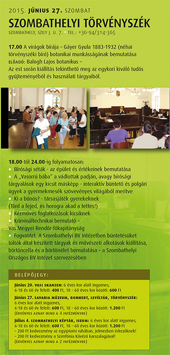 Dr. Kissné dr. Réczeg Katalin, a törvényszék sajtószóvivője örömének adott hangot, hogy a Nyitott bíróság program keretében ismét bejárás nyílik a törvényszék épületébe. Általában bírósági idézéssel veszünk részt egy tárgyaláson, most nélküle is megteheti bárki. A „bűntettek" emberközeliek lesznek, a népmesék szereplői elevenednek meg, aki pedig kedvet érez hozzá, maga is lehet Döbrögi, Jancsi, Juliska vagy épp a gonosz boszorka. Balogh Lajos botanikus Gáyer Gyula néhai törvényszéki bíró botanikai munkásságát mutatja be. Lesz még társasjáték gyerekeknek, kézműves foglalkozások, és a Vas Megyei Rendőr-főkapitányság krimináltechnikai bemutatója.