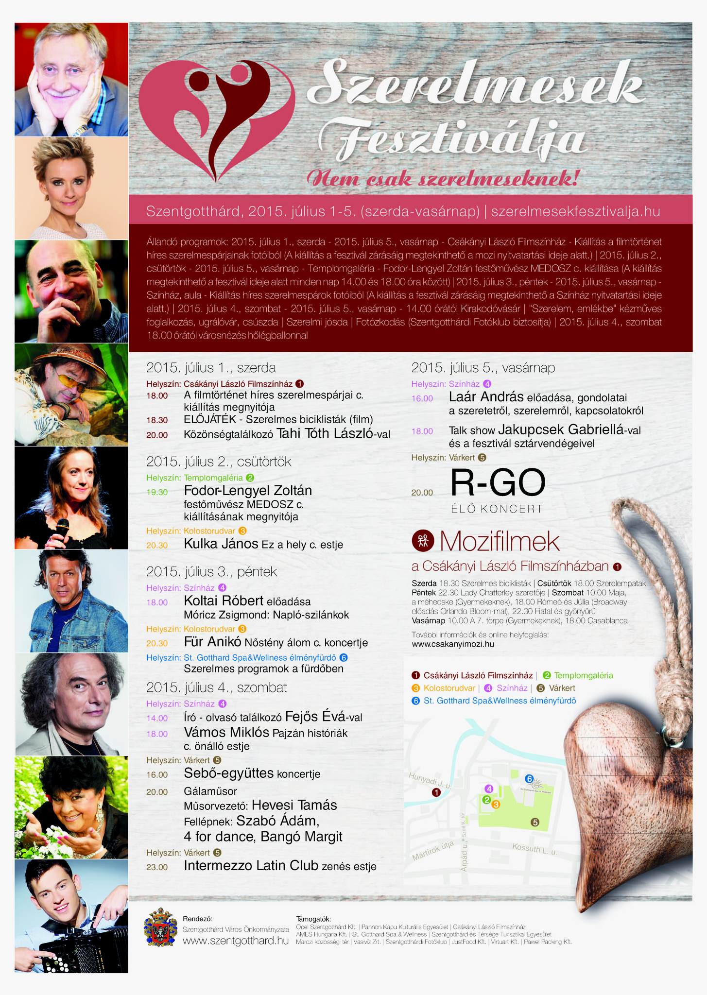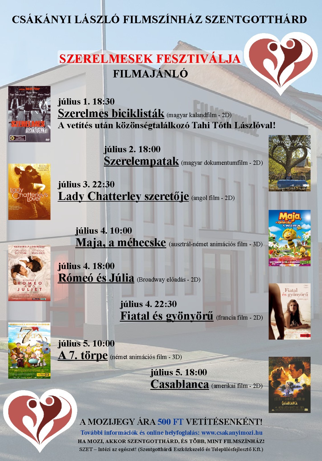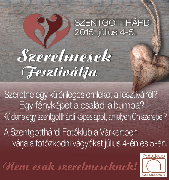 Szentgotthárd szerelmes életet él néhány napig, július 1-5-ig a Szerelmesek Fesztiválja vár mindenkit fergeteges programokkal. Itt lesz Tahi Tóth László, Fodor-Lengyel Zoltán, Kulka János, Koltai Róbert, Für Anikó, Fejős Éva és Vámos Miklós, a Sebő-együttes, de a fesztiválozók szórakozásáról gondoskodik Szabó Ádám és a 4 for dance csapata is. A fesztivál zárásaként Laár András és Jakupcsek Gabriella is Szentgotthárdra látogat, majd az R-GO koncertjén mindenki szerethet is meg nem is. A Csákányi László Filmszínház minden napra szenvedélyes és szórakoztató filmeket kínál, a Szentgotthárdi Fotóklub pedig örömmel várja a fotózkodni vágyókat a Várkertben a fesztivál utolsó 2 napján.