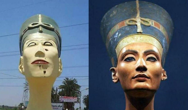 Hatalmas felháborodást keltett Egyiptomban Nofertiti királynő világhírű mellszobrának egy félresikerült másolata, amellyel a felső-egyiptomi Szamálút település bejáratát kívánták szebbé tenni a városatyák. A félresikerült szobrot több közösségi oldalon Frankensteinhez hasonlították. Volt rá okuk.