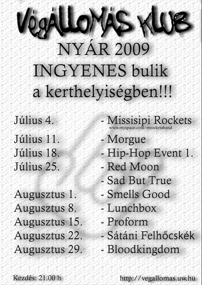 Morgue, Lunchbox, Proform, Smells Good, Mississippi Rocktes - kellemes nyár esti kikapcsolódást kínál a Végállomás Klub az idei nyárra azoknak a fiataloknak, akik nem a különböző fesztiválokon töltik a hétvégéket, hanem itthon keresnek maguknak elfoglaltságot.