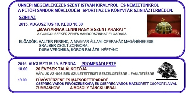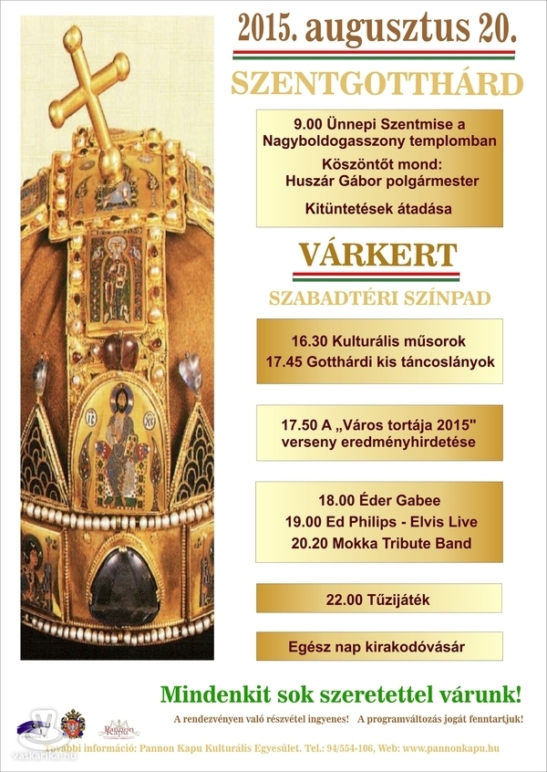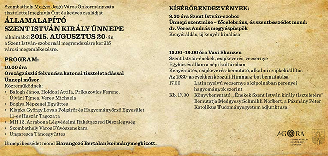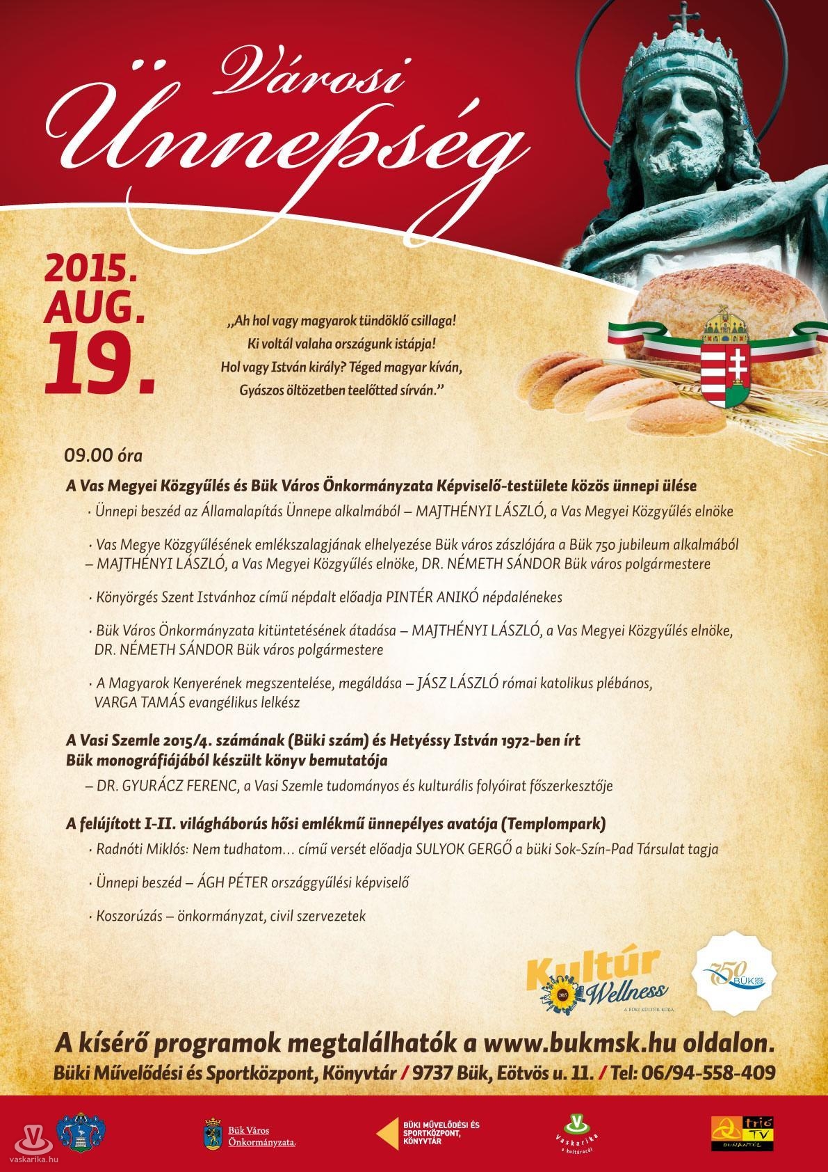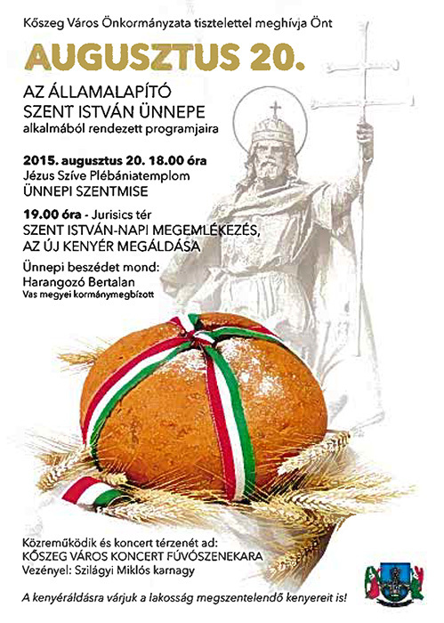Családi programokat, büki ünnepi közgyűlést és ünnepi koncerteket, sárvári Folklórnapot, Körmendi Napokat, Szent István Ünnepet és még számos programot tartogat számunkra az államalapítás ünnepe.