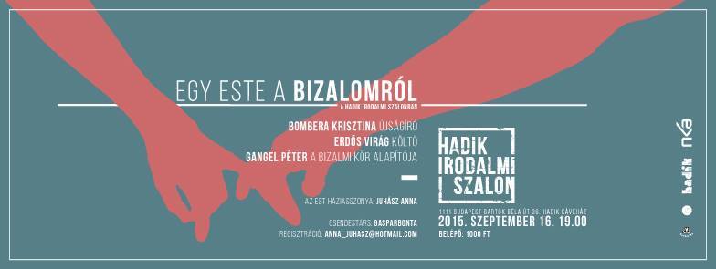 Az ötödik évadban járó Hadik Irodalmi Szalon a szeptemberrel kezdődő évadát egy nagyon aktuális, életünk, társadalmi szerepeink és felelősségünk, emberi kapcsolatainkat befolyásoló és meghatározó témával kezdi. Ez a bizalom. Hol élünk és mennyire számíthatunk egymásra? Mit jelent a bizalom ember-ember között, irodalomban, szerelemben, a társadalomban, üzletben? Milyen erő van a kezünkben, ha művészek vagyunk? Szeptember 16-án ezekre a kérdésekre is választ kapunk - három aspektusból is, Újbuda kedvenc Kávéházában.