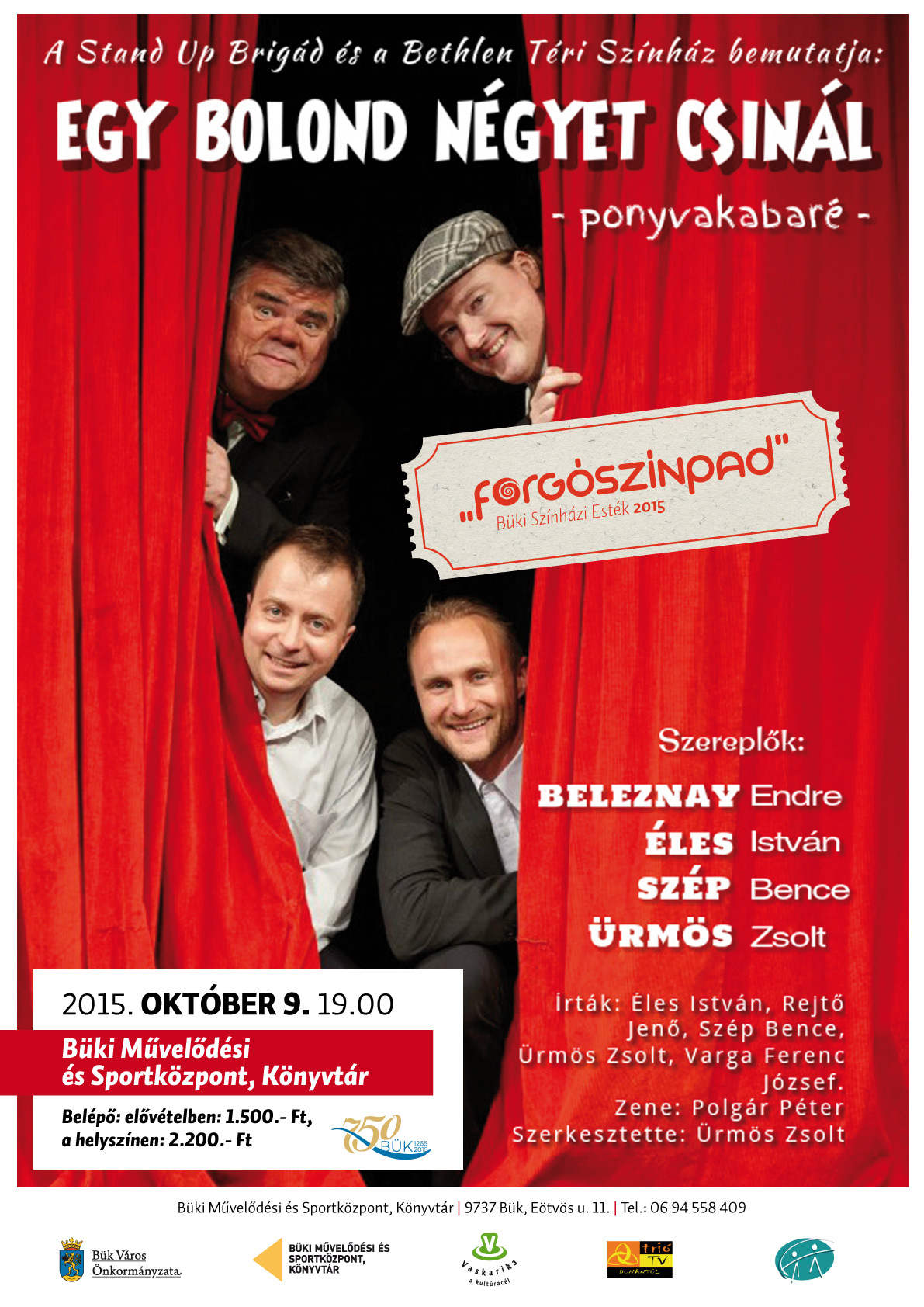 A Büki Színházi Esték részeként október 9-én egy vidám hangulatú estre várják az érdeklődőket: Rejtő Jenő egyik kabaréjelenetére épülő Egy bolond négyet csinál című ponyvakabarét adja elő a Bethlen Téri Színház és a Stand Up Brigád.