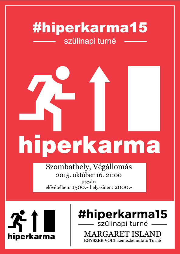 Október 16-án, pénteken a több éves kihagyás után újra koncertező, idén 15. szülinapját ünneplő Hiperkarma érkezik a Végállomásba, hogy bemutassa tavaly megjelent, Konyharegény című albumát. Vendég egy új, izgalmas formáció, a Margaret Island, akik nemrég megjelent, Egyszer volt című nagylemezüket mutatják be a Körmendi úti klubban.