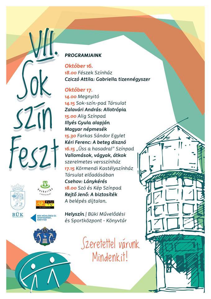 Október 16-17-én hetedik alkalommal telik meg a Büki Művelődési Központ színjátszókkal. A helyi csapat, a Sok-szín-pad Társulat hagyományos házi fesztiválját szervezte a hosszú hétvégére. Most is válogathat a színházkedvelő közönség, hiszen a drámától a népi komédián át, a mozgásszínházig minden lesz a két napban.