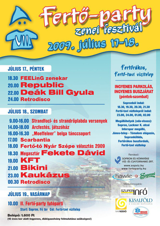 Fertő-tó Nyár Szépe választás, Kaukázus, KFT, Republic, Bikini és Deák Bill koncertek, retrodisco, strandfoci- és strandröplabda versenyek, és ezenkívül is számos izgalmas program várja a tó mellett fesztiválozókat a VII. Fertő-partyn.