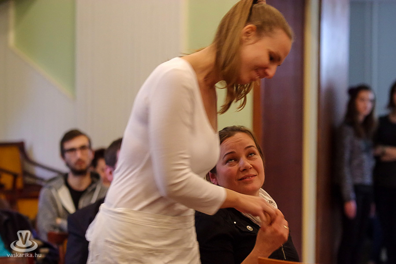A 2014-ben elkezdett tendenciát folytatva úgy gondoltuk, hogy a Sok-szín-Feszt előestéjére ismét egy profi előadással kedveskedünk a nézőknek. Profi előadás, amatőr társulattal. Így érkezett hozzánk Budapestről a Fészek Színház, Cziczó Attila barátom vezetésével. Ismerjük őket már 2007 óta, néhány fesztivált végigizgultunk már együtt, ezenkívül már mi is jártunk náluk a Tisza felső folyása című kamaradarabbal. Családias hangulatban izgulhattuk végig október 16-án a Gabriella tizennégyszer című előadást. Nehezen emészthető darab, nehéz utána bármit is mondani...