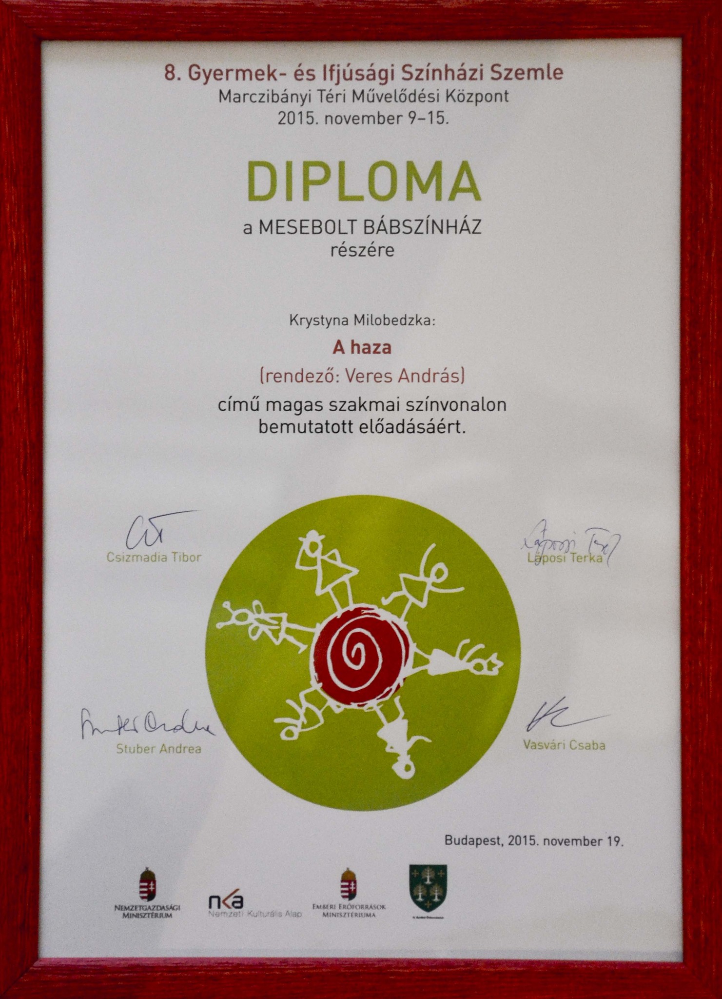 Az Emberi Erőforrások Minisztériuma Ifjúságpolitikáért és Esélyteremtésért Felelős Helyettes Államtitkárság különdíját érdemelte ki A haza című előadás, a zsűri indoklása szerint: „az alkotók azon ambíciójáért, hogy fontos, elvont tartalmakat juttatnak el a gyerekközönséghez játékosan, invenciózus és asszociatív módon; a rendező egyszerűségében elegáns, nagyvonalú elképzeléséért és a megvalósításban megnyilvánuló kreativitásért."