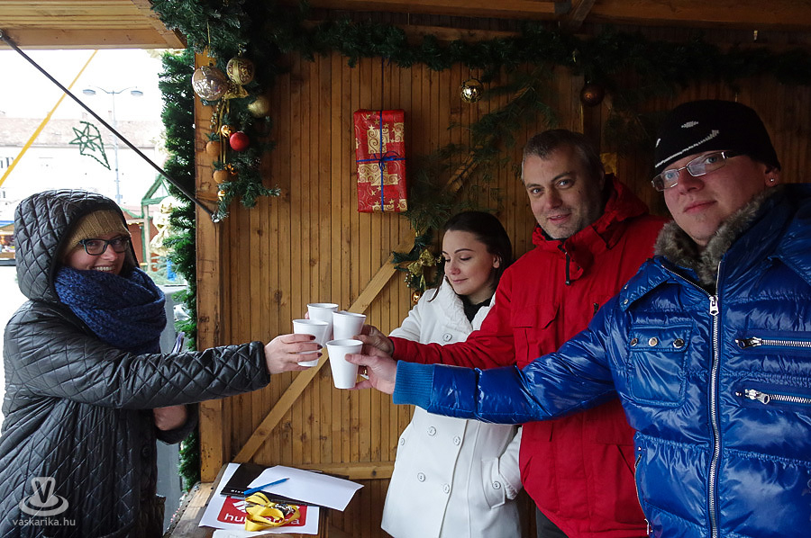 A metsző hideg elől a Karitász épülő pavilonjába menekült "forralt bor bíráló" négyesünk, azaz Pusztai Krisztina, a Nyugat Rádió műsorvezetője, Pálfalvi Róbert, a FÉSZ munkatársa, Nagy Ádám árus, és Büki László, a Vaskarika.hu főszerkesztője. A háziasszonyi teendőket, azaz a borok és a kísérők szervírozását a karácsonyi vásár egyik szervezője, Gosztola Anita vállalta magára.