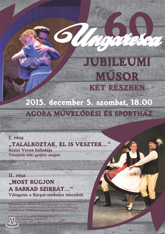 Jegyek 1800 ft-os áron kaphatók az Ungaresca Táncegyütes irodájában (Szombahely, Ady tér 5.) és az AGORA jegyirodában (Szombathely, Március 15. tér 5.)
