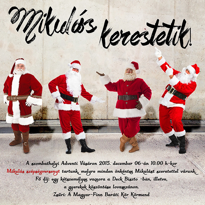 Mikulás szépségversenyre várnak minden önkéntes Mikulást a szervezők december 6-án, az adventi vásáron.