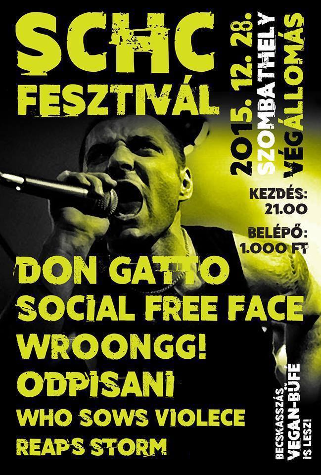December 28-án, hétfőn a hardcore zene rajongóinak szokásos év végi, legendás szeánsza, az SCHC fesztivál kerül megrendezésre. Ebben az évben a Don Gatto, a szlovén Odpisani, a Social Free Face, a Wroongg! és a Who Sows Violence Reaps Storm lép a Körmendi úti színpadra.