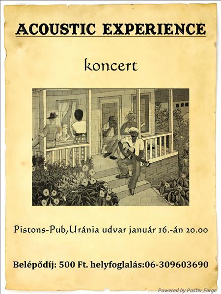 A Pistons Pub felső termében /volt Padlás/ lép fel az Acoustic Experience. Műsoron kedvenc dalaik feldolgozásai, többek között: Doors, Bob Dylan, Eric Clapton, Pink Floyd, Muddy Waters, Robert Johnson.