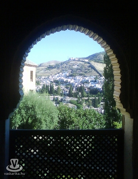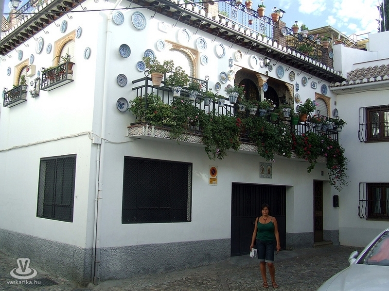 A kilátóról újra megcsodáltuk a lemenő nap vörös színébe öltözött Alhambrát, majd gyalogosan indultunk el az egyre magasabbra kanyargó szűk utcákon, a hófehérre meszelt házak között. Számomra érdekesnek tűnt az, hogy az ablakok magasan, 2 méter fölött helyezkedtek el, hogy ennek mi a magyarázata, nem tudom. Aztán a szép takaros házak kezdtek elmaradozni, egyre kopottabbak és gondozatlanabbak lettek, a környék lepusztulttá vált, látszott, hogy szegényebb emberek lakta városrészbe keveredtünk. Legszívesebben felmentem volna a barlanglakásokig, de már a nap vége felé jártunk, ugyanakkor rajtunk kívül nem sok ember volt az utcákon, ezért visszafordultunk a város felé. Hamarosan beértünk egy, a belváros felé vezető útra, a meredek macskaköves sikátor mindkét oldala tele volt marokkói áruval teli boltokkal, amelyek színes kelméket, bódító illatú fűszereket és csodálatos réz lámpákat árusítottak. De voltak ott tapas bárok, kiskocsmák és kávézók is, amelyekben igazi arab mentateát is lehetett inni a sör mellett.