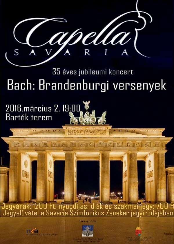 A Capella Savaria idén ünnepli fennállásának 35 éves évfordulóját. Ez alkalomból szeretettel hívja a zenekar a közönséget március 2-án (szerdán), a szombathelyi Bartók Teremben 19 órakor kezdődő jubileumi CD bemutató hangversenyére. A hangversenyen Johann Sebastian Bach Brandenburgi versenyeit adják elő. A hat különböző apparátusú versenyművet a Hungaroton gondozásában megjelenő dupla CD-n örökítették meg, ami a hangverseny idejére fog megjelenni, és megvásárolható lesz a koncerthelyszínen is.