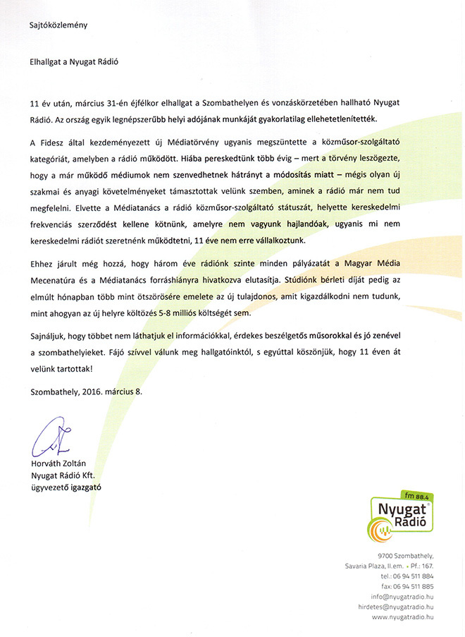 11 év után, március 31-én éjfélkor elhallgat a Szombathelyen és vonzáskörzetében hallható Nyugat Rádió. Horváth Zoltánnak, a rádió ügyvezető igazgatójának szerkesztőségünkhöz eljuttatott közleményét változtatás nélkül közöljük.