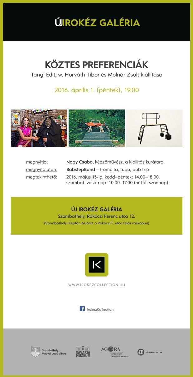 Követve eddigi szellemiségét, a szombathelyi Új Irokéz Galéria arra vállalkozott - igaz, csak részlegesen -, hogy betekintést adjon a képzőművészetben zajló legfrissebb történésekbe, egyúttal bemutatkozási lehetőséget adjon a közelmúltban diplomázott három fiatal képzőművész: Tangl Edit, w. Horváth Tibor és Molnár Zsolt számára. Talán nem elhanyagolható, hogy tanulmányaikat mindhárman a Szombathelyi Művészeti Szakközépiskolában kezdték, majd a Moholy-Nagy Művészeti Egyetemen, illetve a Képzőművészeti Egyetemen folytatták. Különböző műfajt képviselnek, azonban a kifinomult gondolatiság, az igényes megnyilvánulás jellemző rájuk. A Köztes preferenciák című kiállítás egyfajta jelzés a mások mellé helyezés, a mások mellett lévő jelenlét helyzetéről.