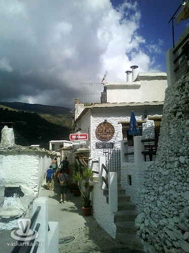 Az első falu, amelybe beérkezünk, Pampaneira, ennél magasabban csak Bubion és Capileira található. Amikor a falu főterén leparkoltunk és felnéztünk a hegyoldalra, szó szerint a fejünk fölött láttuk a másik két falut a hófehér házakkal, a napfényben csillogó kanyargós keskeny úttal - úgyhogy nagyon hamar eldöntöttük azt, hogy tovább nem kapaszkodunk a magasba. Pampaneirát ellenben nagyon alaposan bejártuk. Felmásztunk a legmagasabban fekvő házakig a meredek utcákon, sétáltunk és kávéztunk a tereken, amelyek tele vannak éttermekkel és javarészt isteni serrano sonkát és sajtokat árusító üzletekkel meg ajándékboltokkal - hiszen az utóbbi időben a turizmusnak köszönhetően nagyon sokat fejlődött ez a vidék. Pampaneira a túrázók kiindulópontja, innen érhető el Spanyolország legmagasabban fekvő faluja, Trevélez, amelynek érdekessége az, hogy a település legalacsonyabban és a legmagasabban pontja között 200 méter a szintkülönbség.