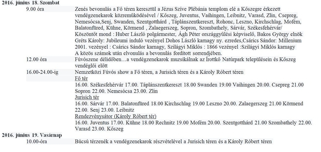 Ismét jó ebédhez fog szólni a nóta, hiszen a vendégzenekarok muzsikálnak a kőszegi vendéglők előtt. A magyar fúvószenekarokon kívül lesznek szlovákok, csehek, lengyelek, németek, svájciak, osztrákok, horvátok, némely országból több zenekar is érkezik Kőszegre, hiszen velük mind-mind jó kapcsolatot ápolnak a kőszegi fúvósok.