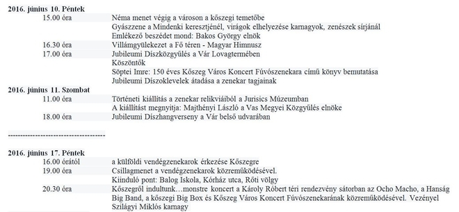 A jubileumi esemény részeként bemutatásra kerül Söptei Imre 150 éves Kőszeg Város Koncert Fúvószenekar című könyve. Június 11-én pedig történeti kiállításra látogathatnak el az érdeklődők a Juricsis-várba, hol megtekinthetik a zenekar relikviáit.