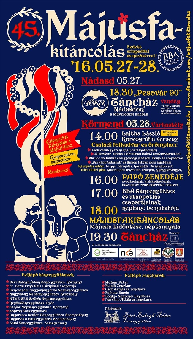 Az ünnepi előestén, 27-én, pénteken a nádasdi tanulók 17.00 órától „Kismájusfa kitáncolást" tartanak, utána a TÉKA Zenekarral táncház következik, melynek vendége Varga Zoltán koreográfus.