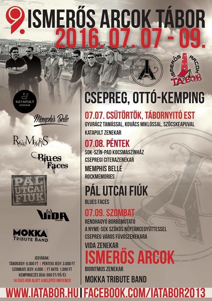 PUF, Ismerős Arcok, Memphis Belle, Katapult, Blues Faces - igazi felhőtlen szórakozást, oldott hangulatú koncerteket ígér a kilencedik Ismerős Arcok Tábor Csepregen! A háromnapos fesztiválra a tábor szervezői nemcsak a rockzene szerelmeseit várják, hiszen a kínálatban néptánc, kézműves foglalkozások és egyéb tábori programok is helyet kaptak.