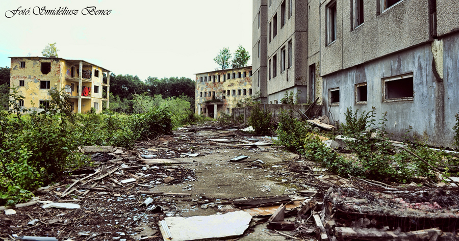 Az elhagyatott helyen legalább öt panelépület áll, és ha elég bátrak vagyunk bemenni a sok gaz és szemét közé, akkor lepusztult téglaházakat is találhatunk. A vasbeton panelépületek szikáran merednek az ég felé, és bár belül az összes le van harcolva, falaik és lépcsőik még mindig állnak.