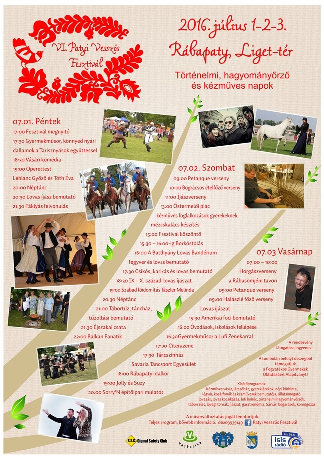 Rábapatyon hatodik alkalommal kerül megrendezésre a kulturális, kézműves és történelmi hagyományőrző „Patyi Vesszős Fesztivál”, amely számos érdekes kulturális, szórakoztató, hagyományőrző, programmal, várja az érdeklődőket július első hétvégéjén.