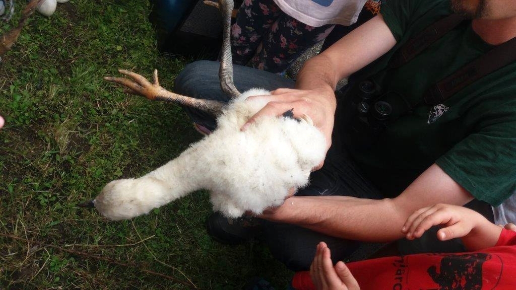 Az előkészületeket Kovács Levente parancsnok felügyelte, akinek ezúton is köszönjük, hogy térítésmentesen a rendelkezésünkre bocsátotta a járművet. A szakembereket gyorsan kíváncsiskodók hada vette körül. A leglelkesebbek - egyesületünk tagjai mellet - a helyi óvodások voltak, akik csillogó szemekkel követték az eseményeket. Az akció a fiókák lehozatalával kezdődött. Erre Koszorús Péter, az MME tagja vállalkozott. A darusautó kosarából kihajolva kiemelte a két kis állatot. Már a levegőből jelezte, hogy probléma van. Az egyik madár lábára műanyag zsinórok tekeredtek. A földön aztán kiderült, hogy sajnos nagy a baj. Szegény állat annyira beletekeredett a csapdába, hogy azok a bal lábát mozgásképtelenné tették, és még a combja húsába is belevágtak. Nagy szerencse, hogy a helyszínen volt Dr. Kóta András állatorvos, az MME Vas Megyei Helyi Csoport titkárhelyettese, aki "svájci bicskájával " eltávolította a kisgólya „bilincseit". Az állat egy időre a kőszegi Chernel-kertben lévő madárkórházba kerül. Sajnos a gyűrűzéséről le kellett mondanunk.