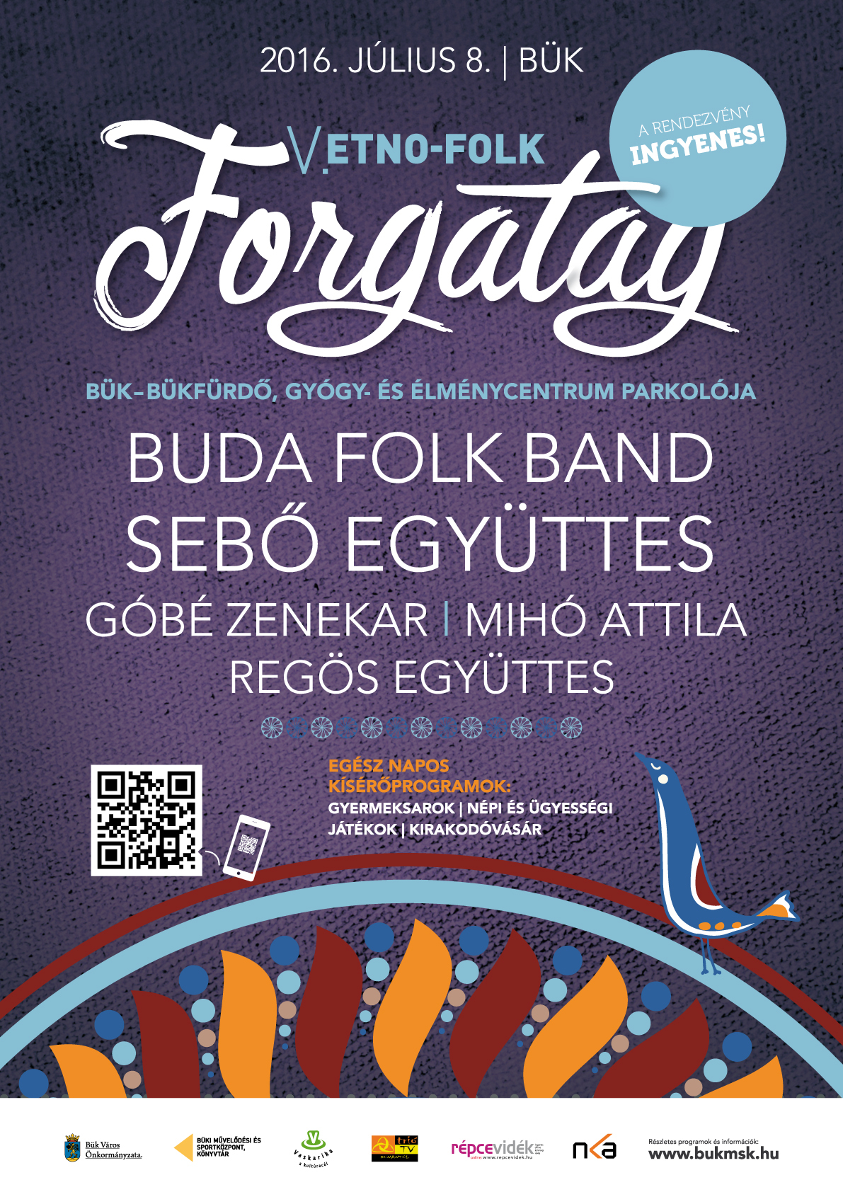 Július 8-án, pénteken ötödik alkalommal kerül megrendezésre Bükfürdőn az Etno-Folk Forgatag. Ebben az évben közreműködik a 2014-ben a World Music Charts Europe második helyéig jutó, saját meghatározása szerint magyar világi népzenét játszó Buda Folk Band, a hatvanas évek végének izgalmas pezsgését, a beat és a költészet egymásra találását bemutató Sebő együttes, a Kárpát-medencei népzenei hagyományt szabadon variáló, azt lazán és izgalmasan a jazz, a blues, a reggae és a klasszikus zene elemeihez kapcsoló Góbé zenekar, a táncházi muzsikát, történeti zenét, énekelt verseket játszó Regös együttes és Mihó Attila prímás.
