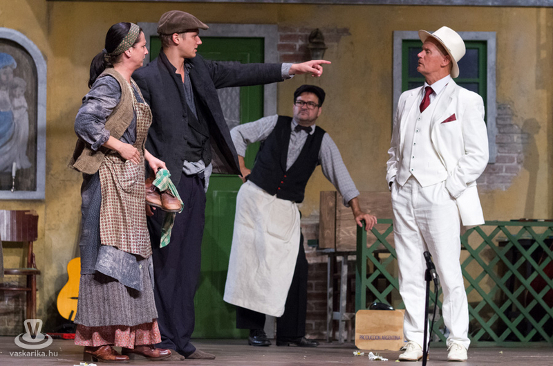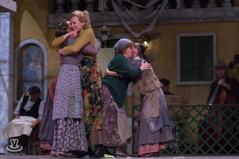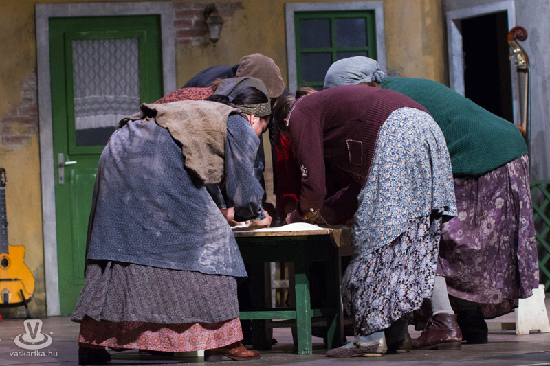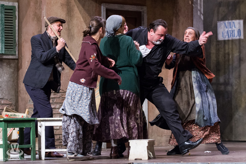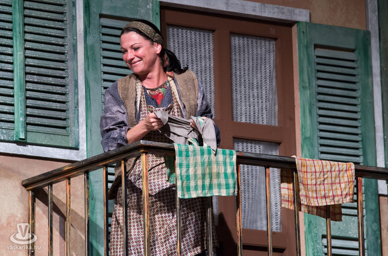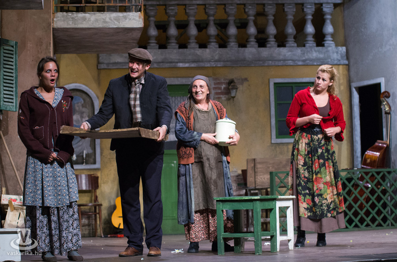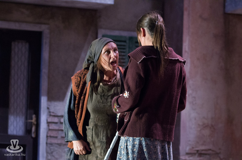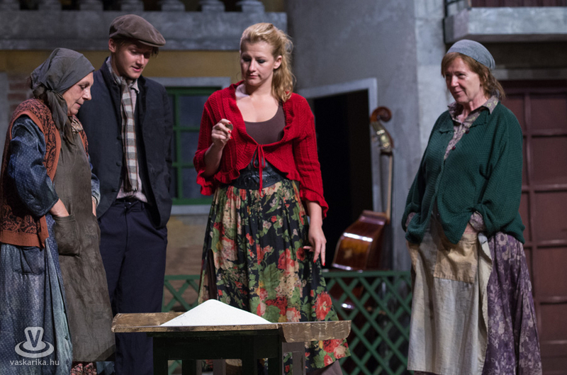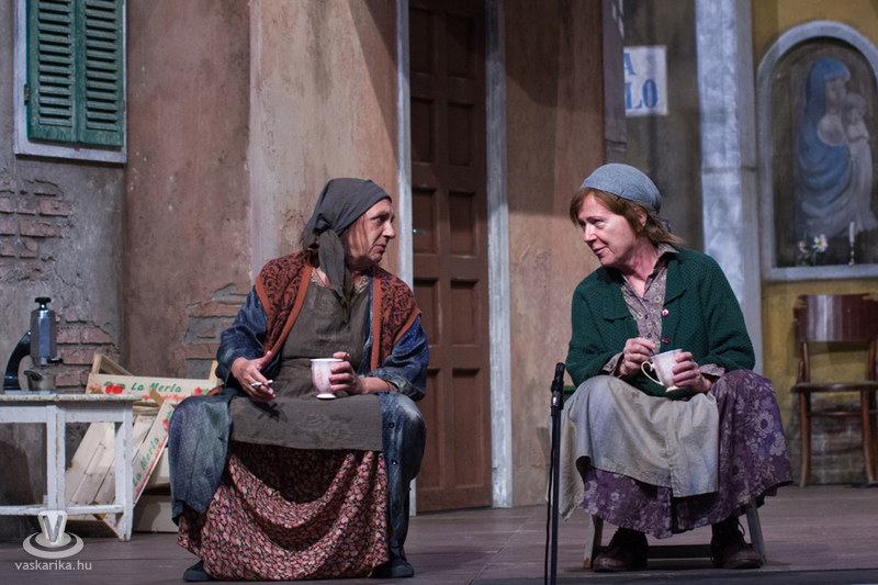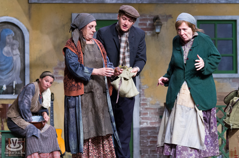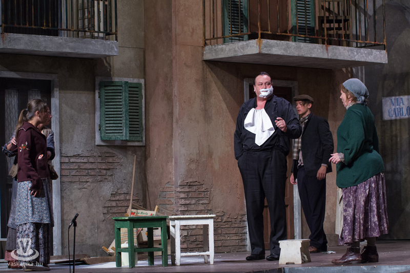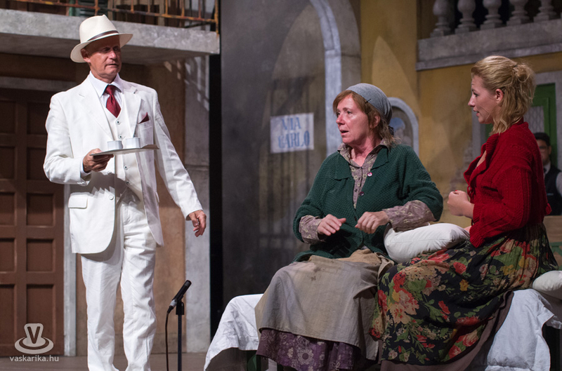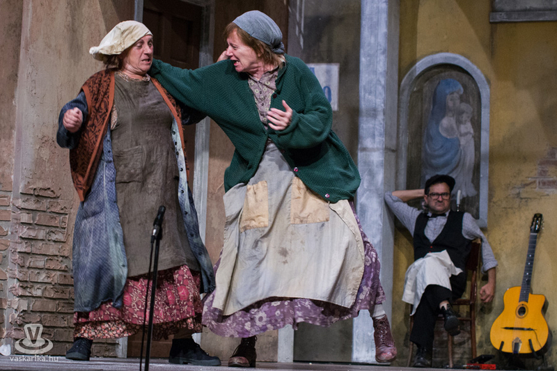Életkoruk miatt gúnyolják a másikat, és eleve esélytelennek tartják a férjfogásra, de saját magukat természetesen alkalmasnak vélik. Kinézetük a jelmeztervezőt és a sminkest dicséri, fantasztikusan festenek az alsóbb réteghez tartozó mohó, ám öntudatos idősödő asszonyaiként. Donna Pasqqua Polegana kissé süket ugyan, ám ami fontos a számára, azt meghallja, Panchiana pedig fogatlan. Még egy nő lakik a terecskén, Orsola, a fánksütő asszony (Pap Lujza) és a fia is vele él, Zorzetto (Jámbor Nándor). Zorzetto Gnese-be szerelmes, aki a gyerekkori barátságuk ellenére vonakodva fogajda a fiú érzelmeit. Anzoletto, a házaló divatcikk-kereskedő (Rózsa Krisztián) érkezése izgalomba hozza a lányokat, ugyanis sorsjátékot játszanak, aki nagyobb számot húzza, az lesz a győztes. Komolyan veszik a játékot, azonnal megindul a vetélkedés, féltékenykedés. Lucietta szerelmes Anzolettoba, és a férfi is vadul félti a lányt, ám mindez nem akadályozza meg abban, hogy ne menjen be Gnese házába eladni neki egy-két dolgot. Egy idegen férfi jelenik meg a terecskére néző fogadóban, Astolfino Gróf, a nápolyi nemesember (Epres Attila), aki alaposan felborzolja a kedélyeket. Gazdagnak tűnik, bőkezűen osztogatja a pénzét, de később kiderül, hogy elszegényedett. Mi mást akarhatna ő is, mint nősülni. Úriember módjára méri fel a terepet, vajon ki lesz a legalkalmasabb arra, hogy a felesége legyen. Gasparinánál állapodik meg, nagybátyjával meg is kötik az alkut. Egy vígjátékban azonban nem mennek a dolgok olyan simán, félreértések, kicsinyes bosszúk, csetepaték, veszekedések teszik színessé, és el kell dördülnie a fegyvernek is, hogy rend legyen már végre. Mindenki szerelmes tehát, mindenki vár valamit (pontosabban valakit), és hogyan alakulnak majd a dolgok? Nézzék meg a darabot, de annyit elárulunk, hogy vígjáték lenne, ha nem találna mindenki a párjára?