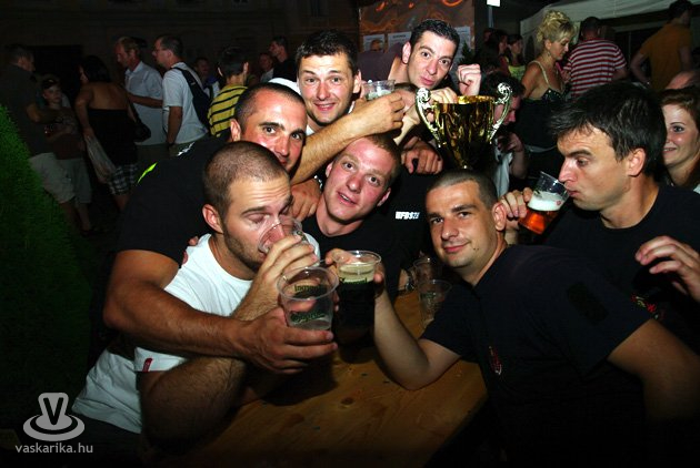 Visszalátogattunk a Sörtérre, újabb folyékony kenyéradagunkért, ahol épp a Mira Orient hastáncosai táncoltak kifogyhatatlan energiával. A Sörtér színpada mellett a rongylabdás fociőrület nyertesei, a szombathelyi tűzoltók, hatalmas üdvrivalgás közepette ittak az elnyert serlegből. "Hogy iszik egy tűzoltó?" - hangzott a kurjantás a vidám csapattól. Az alkalomhoz illően - tesszük hozzá. Kupából.