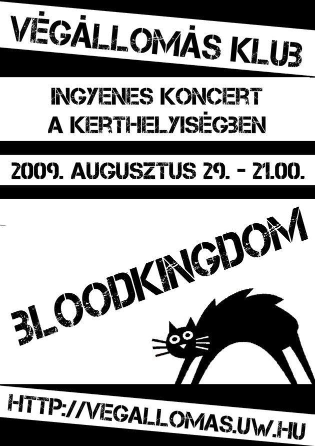 Augusztus 29-én, szombaton a Végállomás nyári szabadtéri koncertsorozata a befejező rendezvényéhez érkezik. Az est fellépője a Bloodkingdom igazi, kemény, fejbe vágós death metal muzsikával örvendezteti meg az érdeklődőket. A zenekar hozza magával kedvenc zenéit is, így garantált a koncert előtti és utáni jó hangulat is, hasonló stílusban. Kezdés a megszokott 9 óra, zárás a közönség hangulatától függ, a belépés ingyenes!