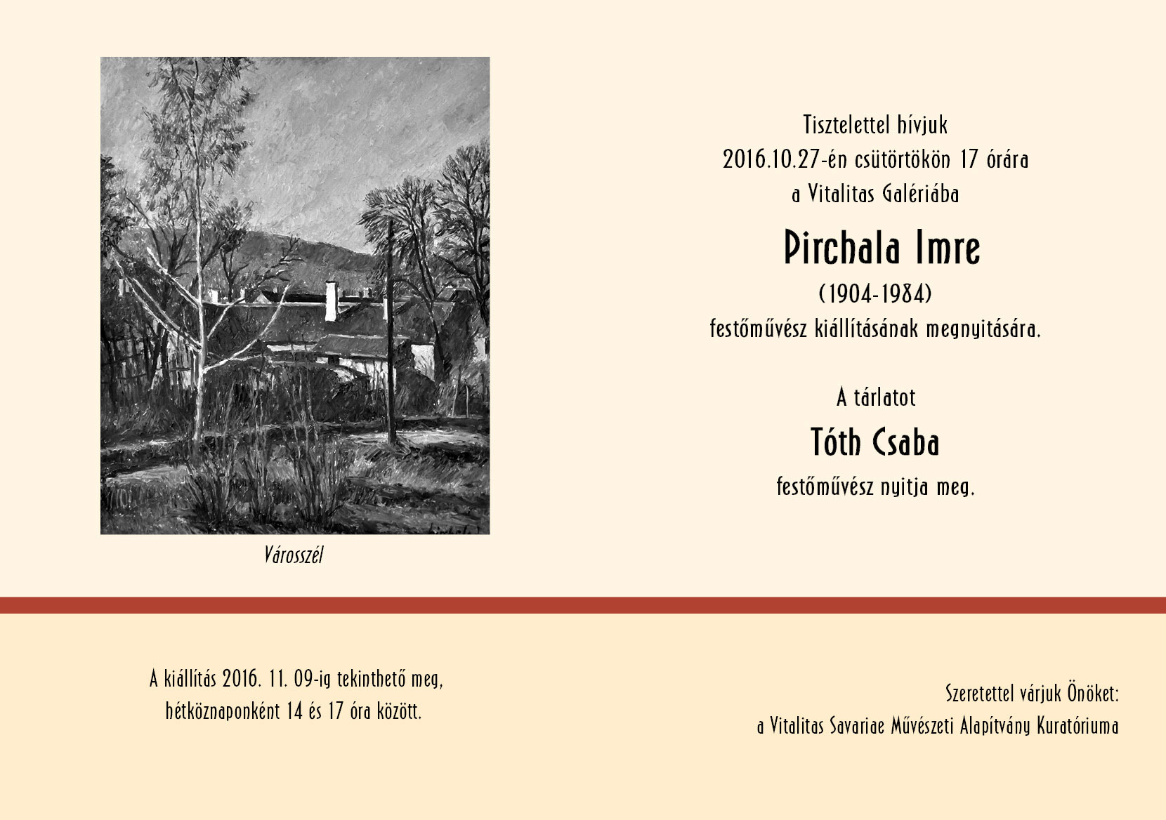 Pirchala Imre (1904-1984) festőművész kiállításának megnyitója. A tárlatot megnyitja Tóth Csaba Munkácsy díjas festőművész.