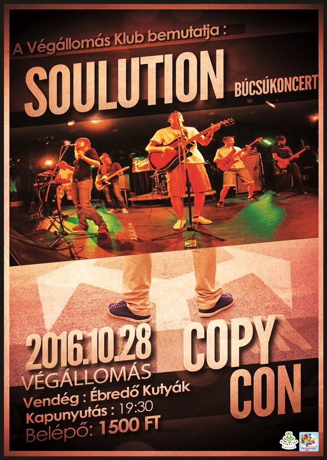 Az este különlegességét egy kevéssé szívderítő esemény adja. Utoljára lép színpadra városunk hosszú évek óta egyik legnépszerűbb formációja, a Soulution. A srácok ígérete szerint a koncerten a teljes, régi felállás tiszteletét teszi, hogy egy felejthetetlen bulival búcsúzzanak lelkes közönségüktől.
