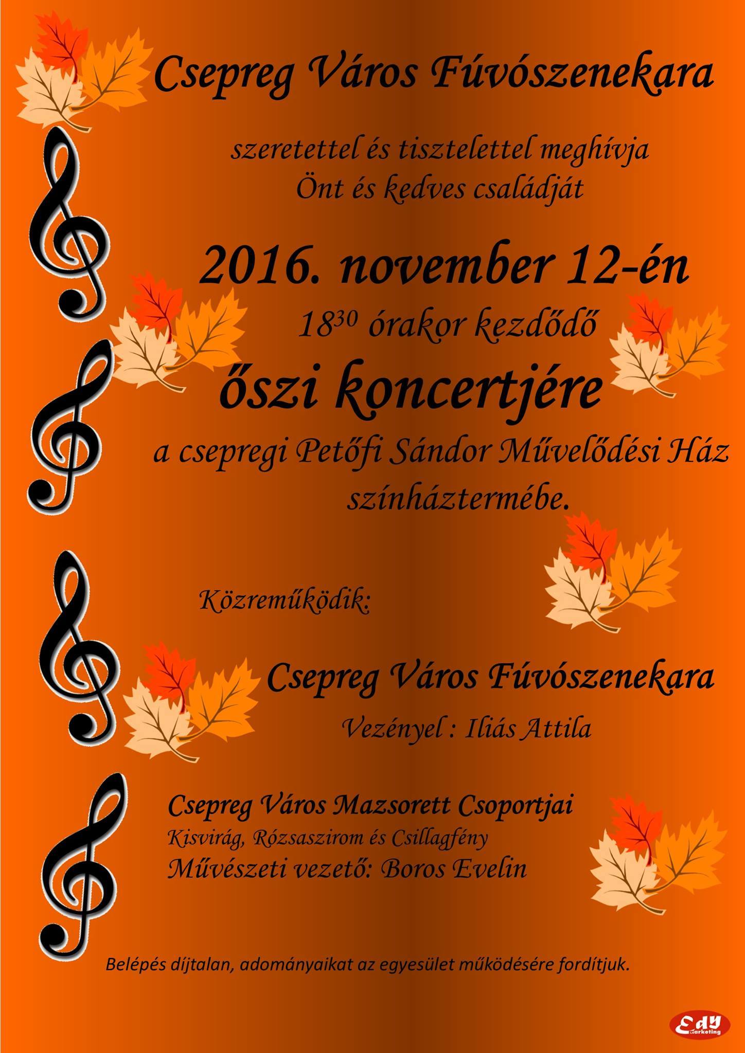 A 2013-as évben "Koncertfúvós" C kategóriában kiemelt arany minősítést szerzett Csepreg Város Fúvószenekara november 12-én tartja hagyományos őszi koncertjét a csepregi Petőfi Sándor Művelődési Ház színháztermében. Igényes fúvószenekari indulók, polkák és slágerfeldogozások csendülnek fel az est folyamán. A műsorban közreműködnek Csepreg Város Mazsorett csoportjai.