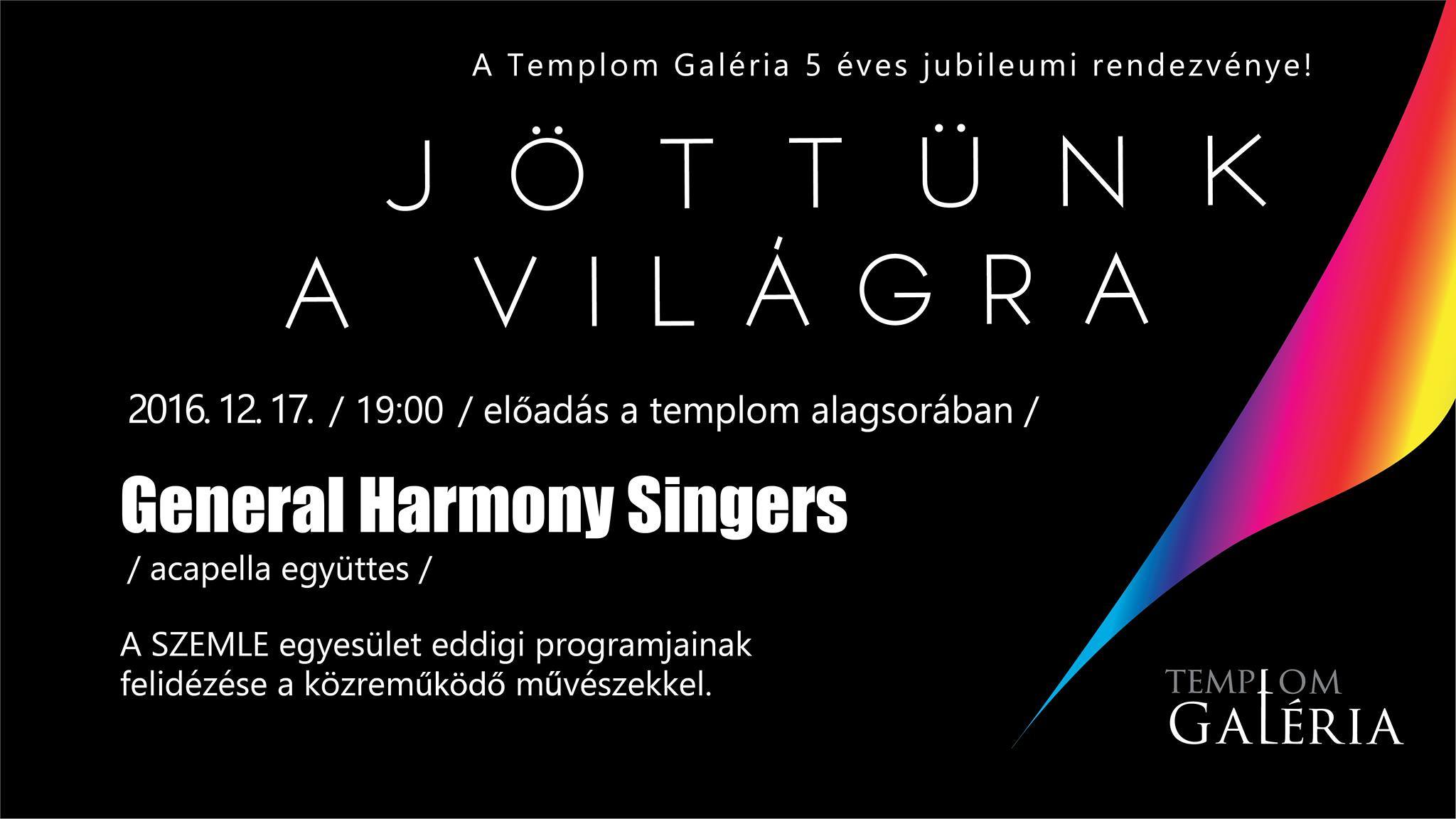 A SZEMLE egyesület immár 5 éves jubileumi kiállítása igyekszik ilyenkor karácsonykor mindig valami meglepetést létrehozni. Idén, úgy, ahogy 5 éve is a legnagyobb támogatási részt Zsidai Csomós családnak köszönhetik. Külön öröm a szervezők számára, hogy a sok nehézség ellenére az utolsó hetekben hirtelen mindig megnő azon művészek csatlakozási vágya az eseményhez, akik semmi mást, csak szeretetet, közös találkozást szeretnének. Ez a megindító rendezvény a látogatók, a Budapestről, Szombathelyről érkező művészek, és az itt élő, alkotni vágyók nélkül nem jöhetne létre. A rendezvényen fellép a GENERAL HARMONY SINGERS acapella együttes.