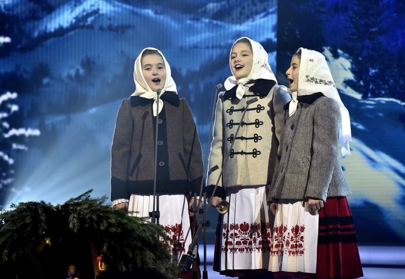 A Cickom Énekegyüttes nagysolymosi karácsonyi kántáló énekeket ad elő a Fölszállott a páva döntőjében. MTI Fotó: Máthé Zoltán