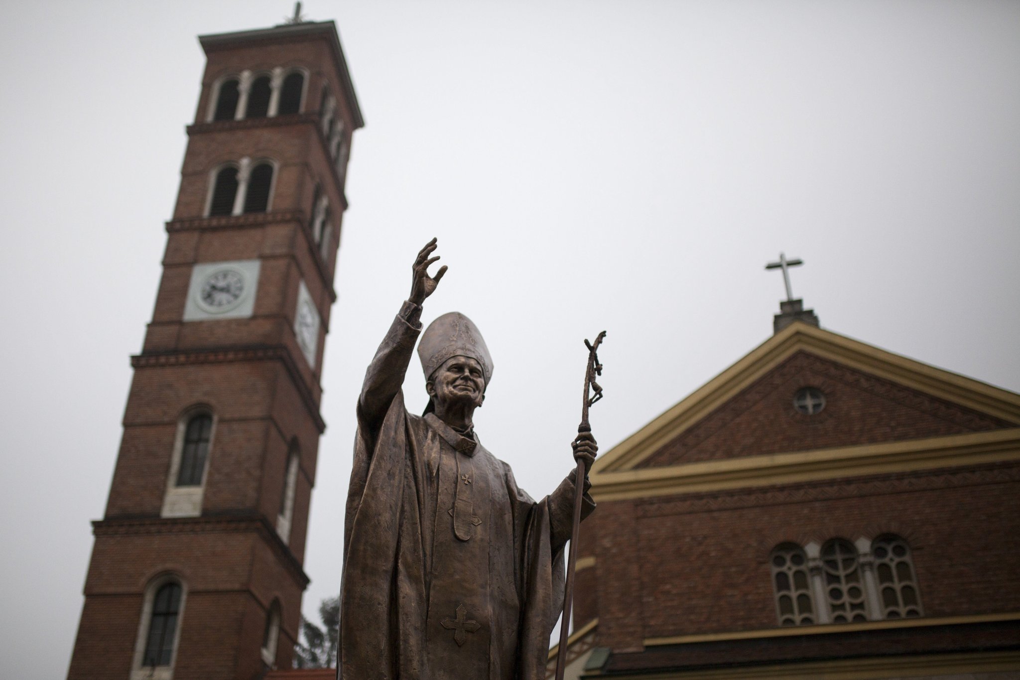 Szent II. János Pál pápa szobra az avatóünnepség napján Szombathelyen, a Szent Kvirin Szalézi Plébánia és Rendház előtti téren 2016. december 21-én. MTI Fotó: Varga György