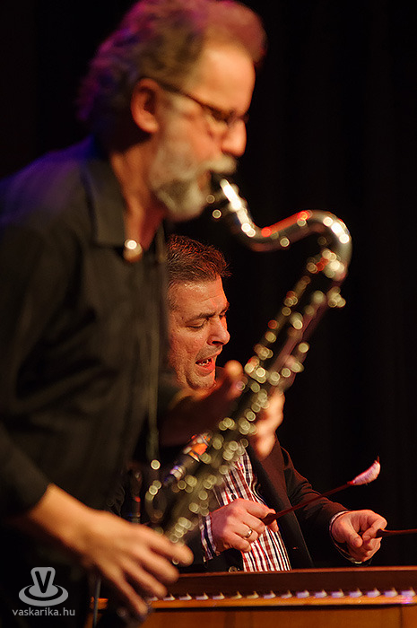 A Bartók- gyűjtésből származó, tárogatóval bejátszott lassú, felvezető népdal-blues a kortárs zene kategóriája már, mely visszajön a vadul, szilajul berontó cimbalom-rögtönzés után is, mintegy keretezve azt. Lukács ördögi zenét művelt hangszerével: keleti dallamok, vad sztakkátók, majd szárnyaló, lebegő, csípett húrokkal előcsalogatott hangulatjátékok váltották egymást, a mennyben és a pokolban. Az imént a cimbalmot, mint zongorapótlót írtam le, de nem: a Lukács megszólaltatta cimbalom nála több, mint a zongora: kísérőhangszer, szólóhangszer, ritmushangszer is. Andris itt ismét kapott lehetőséget sokoldalúságát bizonyítandóan kézidob-szólójának bemutatására. Ujjaival, tenyerével, halkan-hangosan, gyorsan-lassan játszott a bőrön, a kinézete ellenére oly sok finomságot rejtő hangszerén. Az utolsó kérdés (Borbély) c . szomorú éjszakai zene szintén Bartók- gyűjtésből származik. A mélydob és a klarinét duója az est legszuggesztívebb darabja volt: a sötétség, a félelem, az éjszaka hallható, vagy vélhetően hallható neszek egyvelege. A darabra rímelő Az első válasz (Lukács) című szám, szorosan egybegyúrva az előzővel, már vidám hangulatot árasztott: Misi szólói tárogatón, majd a két furulyából egybefaragott, ezért két szólamban is megszólaltatható szláv dvojnice hangszerén vibráltak, persze jellegzetes délszláv ritmusban. Andris ebben a számban harmadszor is megmutatta ötletekből sohasem szűkölő tudását: ezúttal a saját testét használta dobfelületként. Hol a térdén, hol a felfújt arcán, hol a mellkasán, hol pedig az eddig ütőként használt tenyereivel egymáson hozta a ritmusokat.
