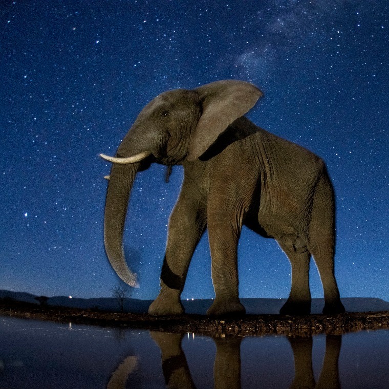 Afrika igen alkalmas az éjszakai fotózásra, mert sok nagyméretű állat él ott - mutatott rá Máté Bence, hozzátéve: a legtöbb csillag nagy látószögű objektívvel látszódik, ezzel azonban kicsinek tűnik a képen látható állat. A sorozat egyik darabján feltűnő elefánt például három, a dámvadak pedig két méterre voltak a fényképezőgéptől - árulta el.