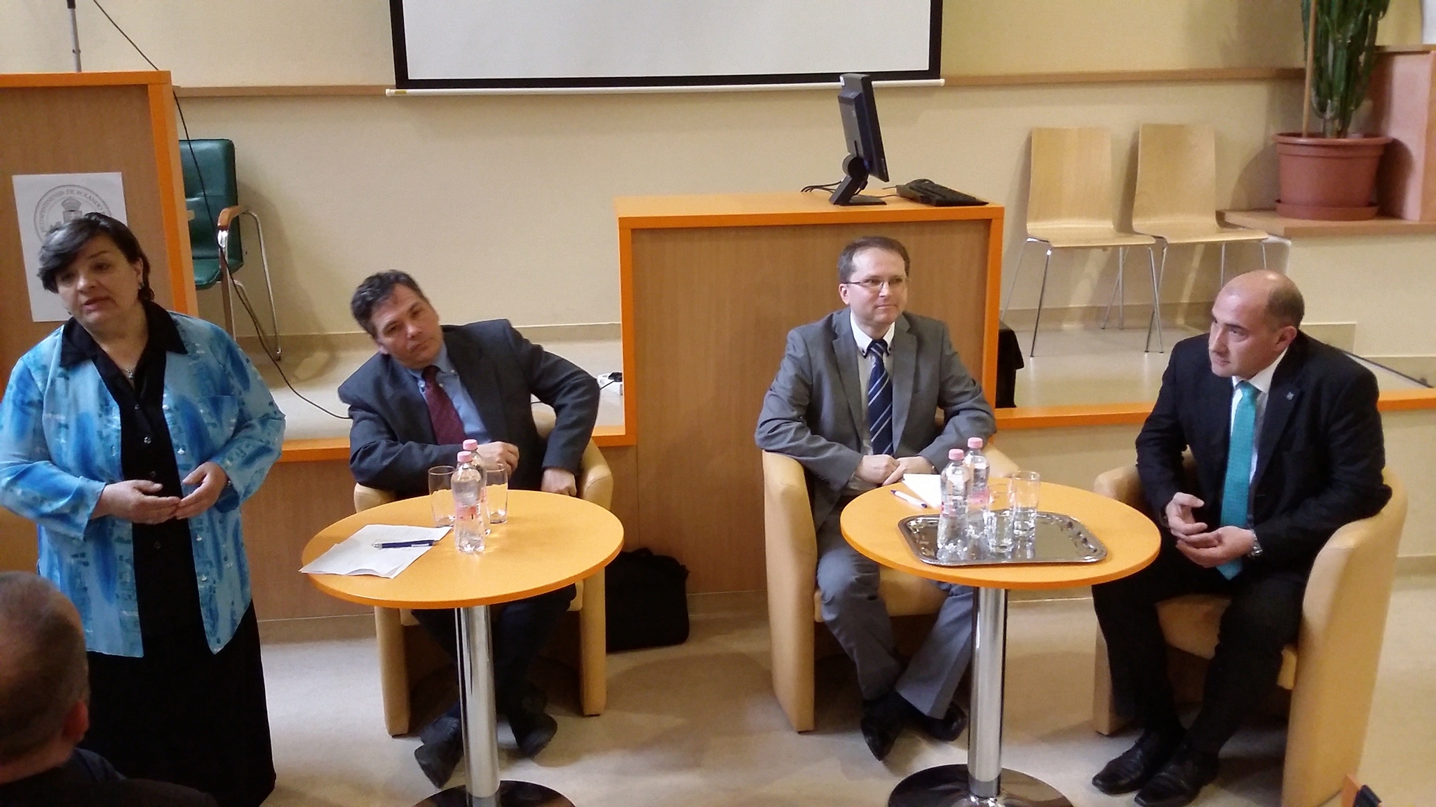 A képen balról jobbra: A beszélgetés moderátora: Székely Klára adjunktus, Dr. Juhász Gábor, a TÁTK dékánja, egyetemi docens, dr. Varga Imre, okl. közgazdász egyetemi docens, Illés Károly, Szombathely MJV alpolgármestere
