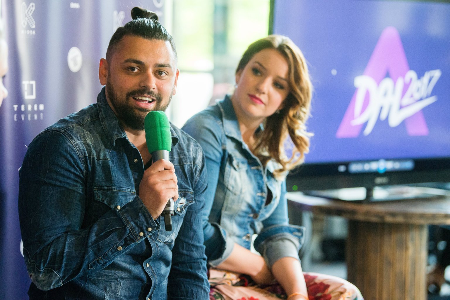 Pápai Joci énekes, a közmédia Dal 2017 című versenyének győztese, a verseny indulója és Rátonyi Krisztina kommentátor az Eurovíziós Dalfesztiválról tartott sajtótájékoztatón a fővárosi Kioskban. MTI Fotó: Balogh Zoltán