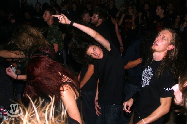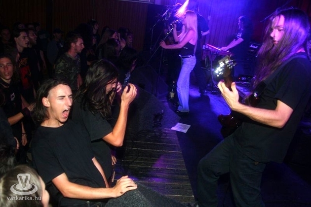 Az "ideák" után a dunaújvárosi Gyöngyvér (Vódli "Jesper" Csaba-dob; Mazán "Mazi" Attila-gitár; Dózsa Erik-ének; Erdős Viktor-basszusgitár; Bessenyei Balázs-gitár) zenekar koncertjébe kapcsolódtunk be, de akárhogy is kerestük, egy szem lányt sem találtunk a bandában, lehetséges hogy ez azért fordult elő, mert majdnem mindenkinek hosszú haja volt. Vajon lehet összefüggés? Nos, ezekután egy kicsit morcosan hallgattuk végig a muzsikusokat, de azt kell, hogy mondjuk, nem tették rosszul a dolgukat. A színpad adottságaihoz képest rendben játszottak, lehetett érezni zenéjükön, hogy a metál edénygyárba jártak szakmai gyakorlatra. A zenekarból külön kiemelendő a hosszú fekete hajú Mazi, aki gitározás közben valószínűleg filmet is nézett, mert a megfelelő fémviszonyok elérése érdekében behúzta a haját. Ezzel ellentétben a közönség nagy része úgy viselkedett, mintha egy tollfosztóban üldögélt volna, és azt nézi, ahogy a bátrabb fehérnépek és férfiemberek hogyan nótáznak fenn a kultúrház színpadán. Meg is jegyeztük többen, hogy biztos villa alakú kesztyűt kötögetnek, mert így télen se fázik a rocker keze. Ezt a monotóniát csak egy-két ember zúzta szét, amikor kimentek sörszínű tintáért a közeli tintabüfébe. Egyebek iránt a koncertek közti szünetben - nem kell rosszra gondolni - jobban is megismerkedtem fotósunkkal. Ő is főiskolás, hosszú hajú, és a bagoly feletti ágon lakik egy fán. De korrigált, mert félrehallottam a 'Bagolyvár felettet'. Csigavér. Vagy gyöngy.