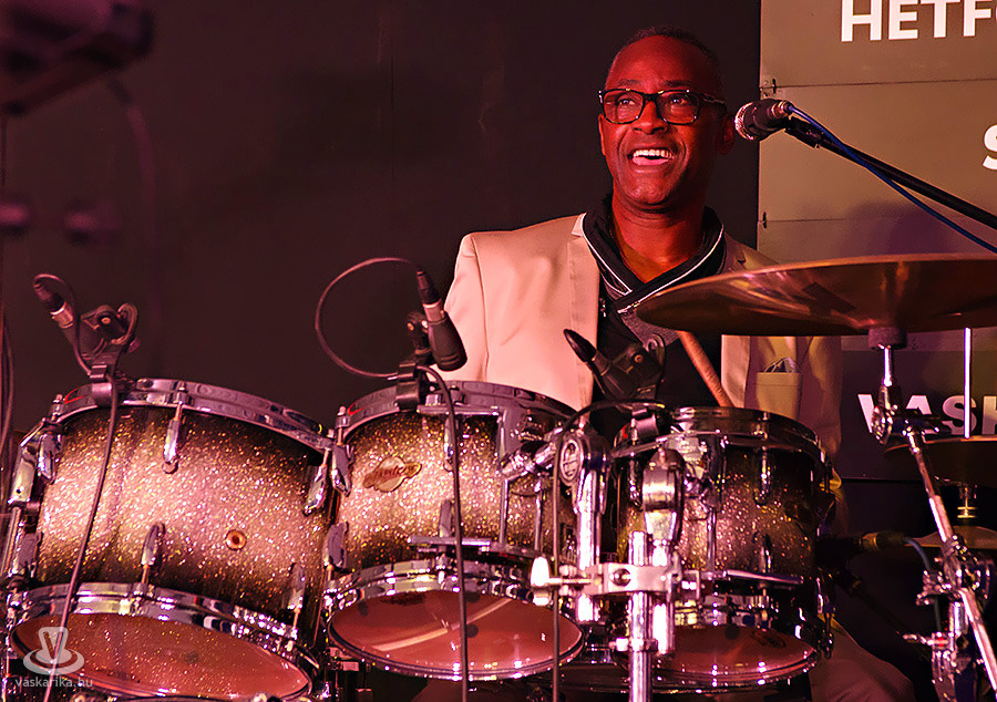 A felvezető funky szám után többen összenéztünk: az ügyesen táncoló hölgy énekel-e, Jamal csak dobol, és nem énekel? Mi lesz később itt? A jellegzetes funky-ritmusdarálás után a második számban aztán Thomas úr bemutatta hangszereseit, egy kis jazz zenélés keretén belül. Sorrendben a trombitás, a harsonás, majd a zongorista, gitáros, a basszgitáros, végül a dobos is megmutatta: tudnak jazzt játszani, de a konklúziót a fehér öltönyben, szürke garbóban, napszemüvegben, aranyórával csuklóján vezénylő Jamal mondta ki: BUT WE LIKE FUNKY!!
