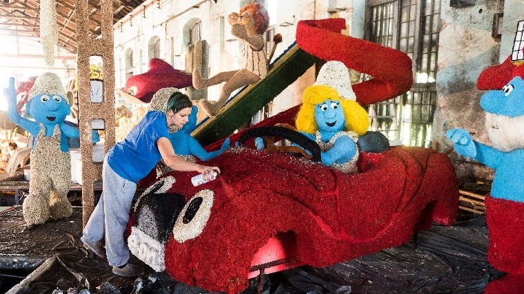 Készülnek a virágkompozíciók az ötvenéves debreceni virágkarnevál augusztus 20-i felvonulására a MÁV Debreceni Járműjavító Csarnokában 2016. augusztus 18-án. - MTI Fotó: Balázs Attila
